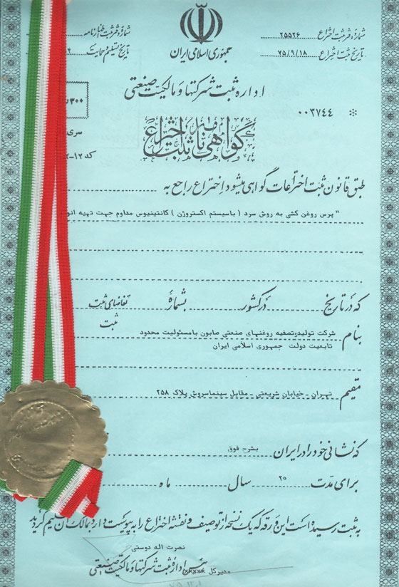 این اختراع در سال 1375 و به شماره 25526 سازمان ثبت اختراعات در کشور به ثبت رسید .