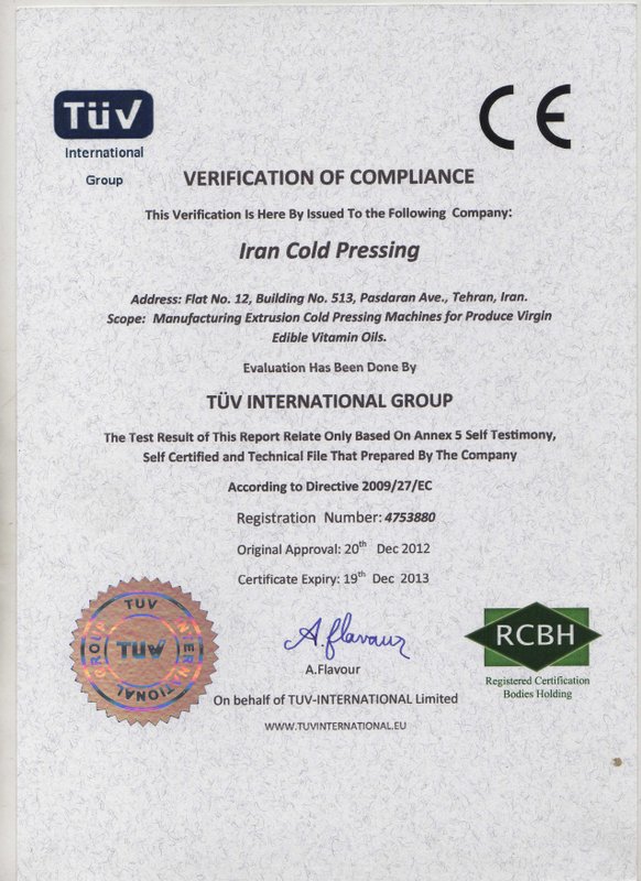 گروه ایران کلد پرسینگ در پی تلاش روز افزون جهت ارتقای کیفیت محصولات خود و رضایت مندی مشتریان عزیز با افتخار اعلام میدارد که موفق به دریافت گواهینامه CE از اتحادیه اروپا گردید .